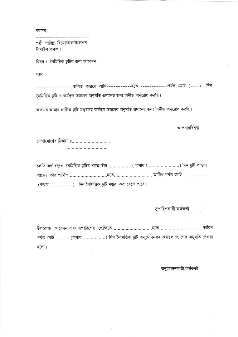 | পিডিবিএফ এর বিভিন্ন ছুটি সংক্রান্ত ফরমেট প্রাপ্তিস্থান: সংশ্লিষ্ট কার্যালয় | বিনামূল্যে | ০৩-০৭দিন | - সংশ্লিষ্ট বিভাগীয় প্রধান, পিডিবিএফ, প্রধান কার্যালয়